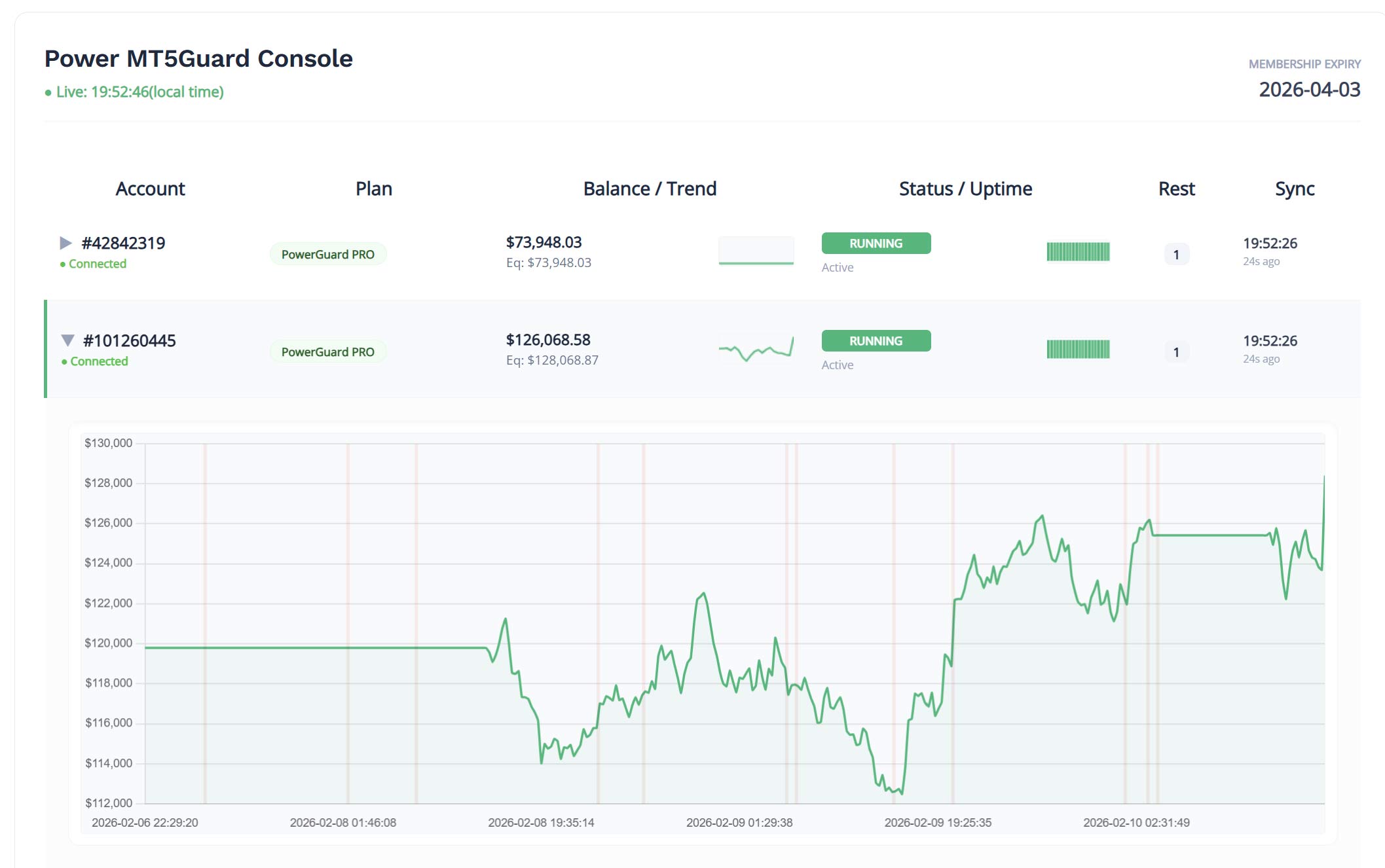 A: Yes. MT5Guard is designed to track all MT5 instances running on the same or difference VPS. You can view the status, uptime, and equity curves for each account individually through our centralized web dashboard.