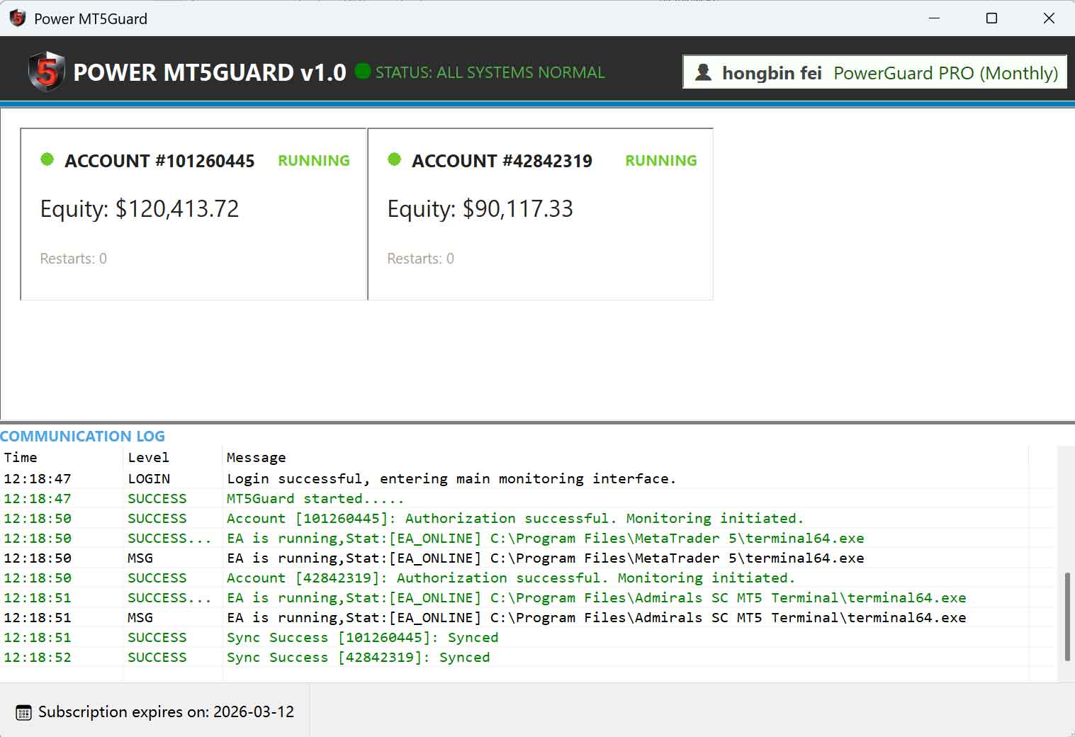 If the dashboard displays your Live MT5 Status and Subscription (Bind) Details after login, the installation is successful.